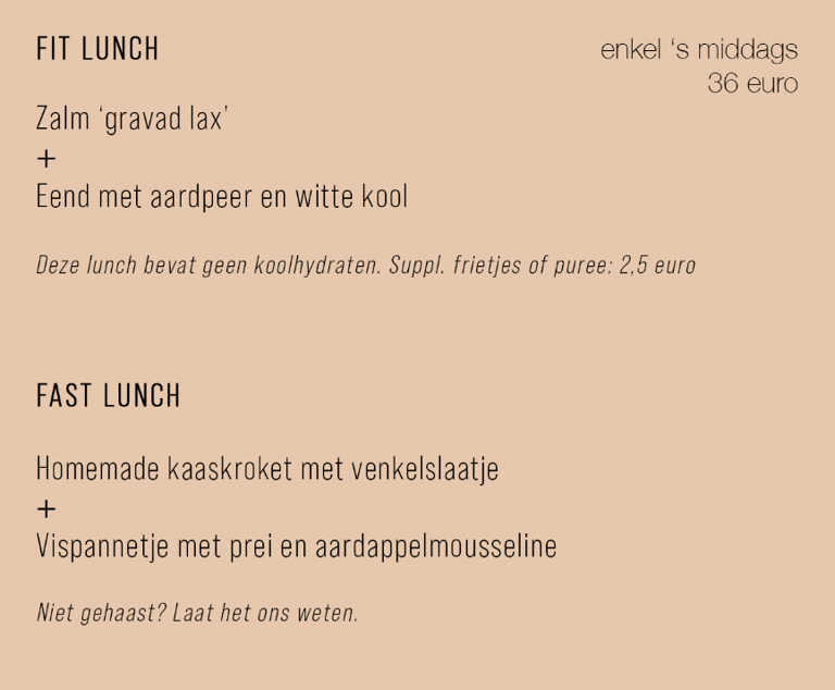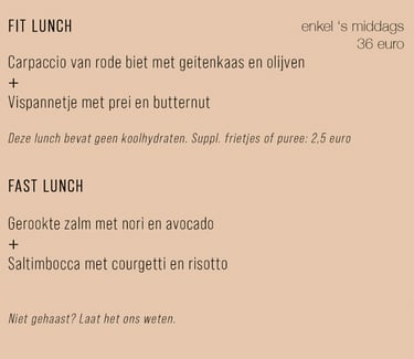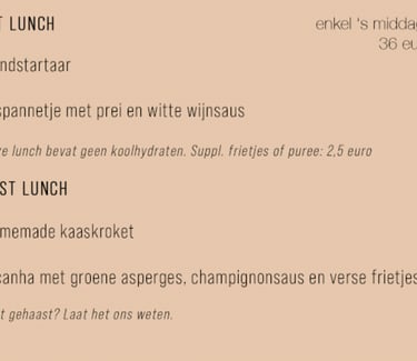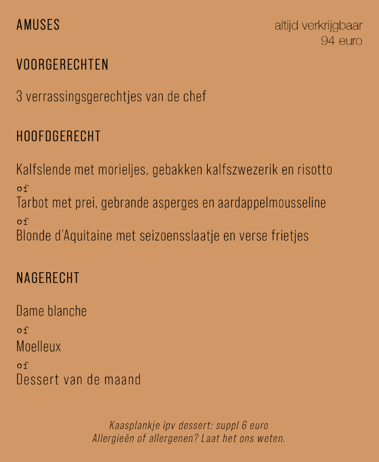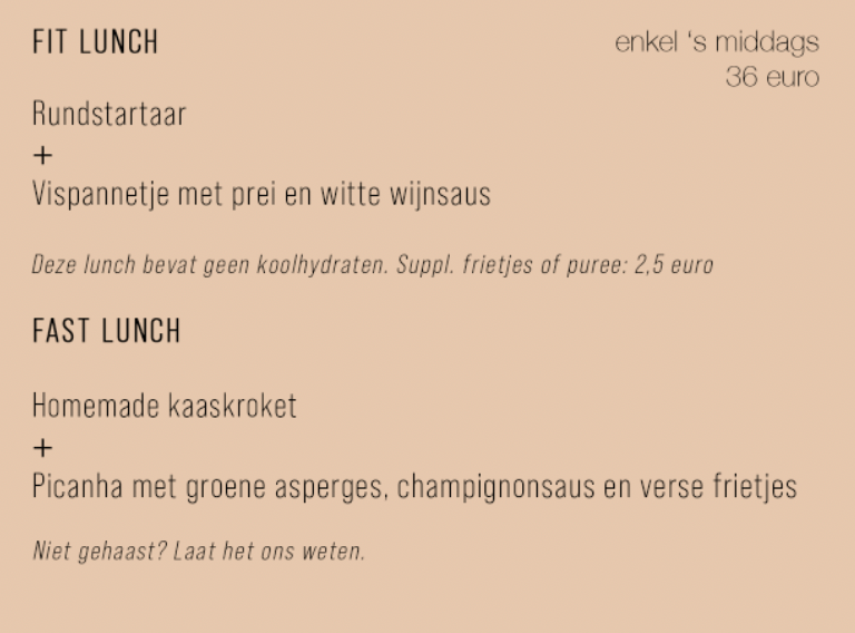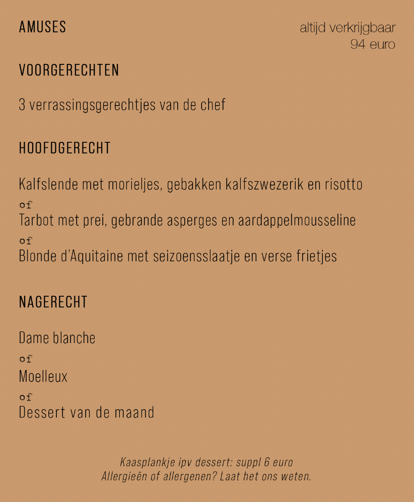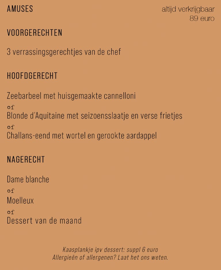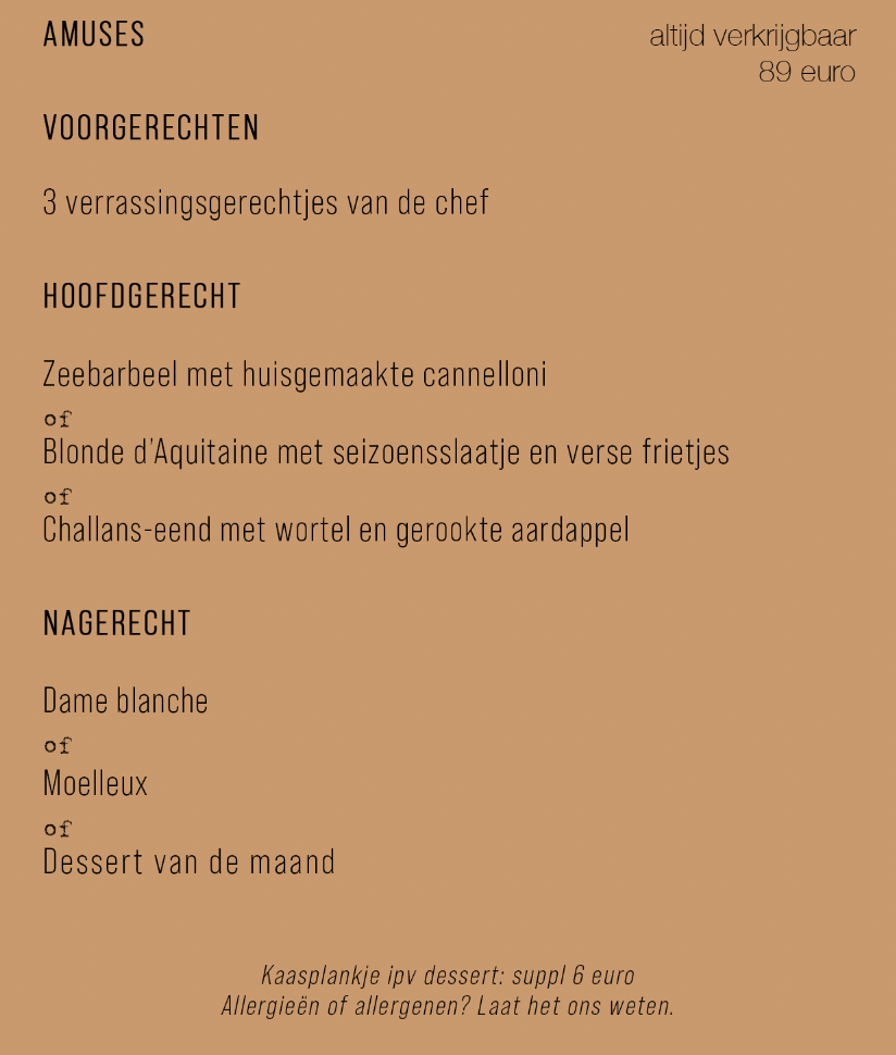 We hebben een beperkte à la carte (enkel tijdens de week verkrijgbaar). Denk aan huisgemaakte garnaalkroketjes, sliptongetjes, etc. Dit wijzigt op de golven van het seizoen.