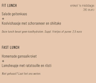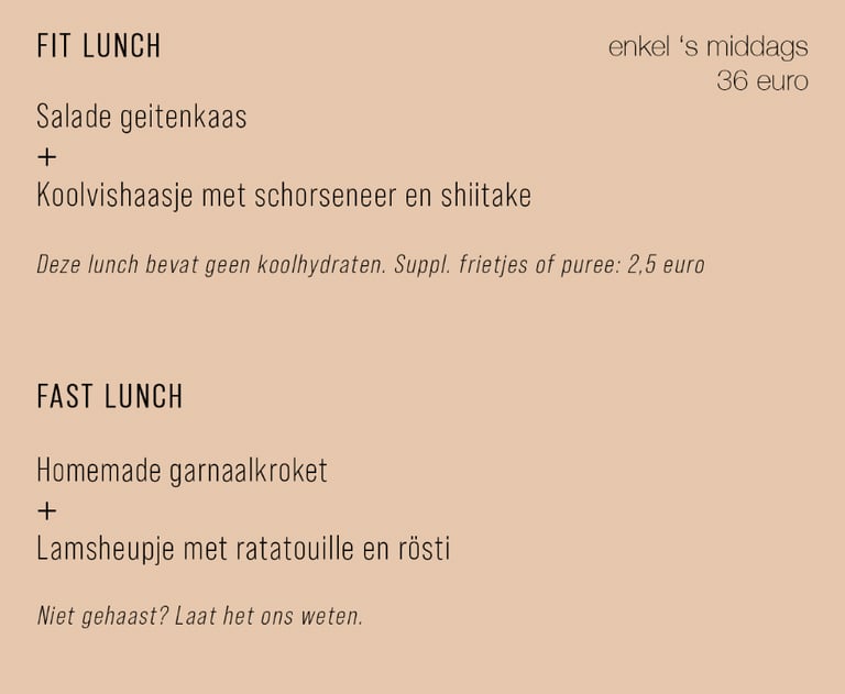 We hebben een beperkte à la carte (enkel tijdens de week verkrijgbaar). Denk aan huisgemaakte garnaalkroketjes, sliptongetjes, etc. Dit wijzigt op de golven van het seizoen.